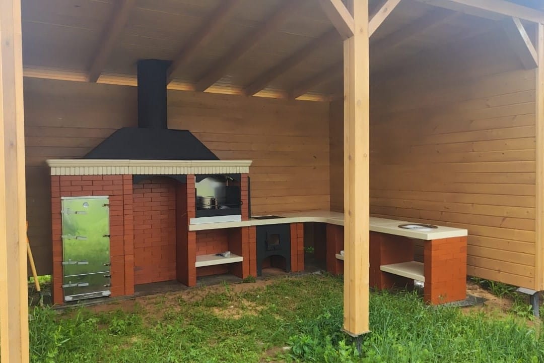 Вы можете разместить модульные печи барбекю на открытом воздухе, так как фасад покрыт декоративной штукатуркой, которая защитит барбекю от внешнего воздействия окружающей среды. Помимо этого можно осуществить установку элементов для приготовления пищи в беседке или на террасе с навесом с помощью переходника на сэндвич трубу. Такой переходник позволит безопасно вывести дымоход сквозь кровлю. За счет двойной трубы с утеплением(сэндвич) вы можете осуществить отвод дымовых газов  и увеличить тягу воздуха, что поспособствует большей теплоотдаче от углей или дров. Комплекс из бетона может состоять из мангала, печи под казан, тандыра, столика с мойкой и углового столика.
